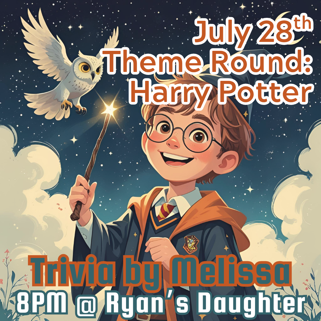 Upcoming Trivia Theme Rounds Upcoming events.Reach out about hosting private events! Sep 29 Theme Round: The Thursday Murder Club Monday, September 29, 2025 8:00 PM 10:00 PM Google Calendar ICS View Event → Sep 22 Theme Round: Stately Songs Monday, September 22, 2025 8:00 PM 10:00 PM Google Calendar ICS View Event → Sep 15 Theme Round: 80s Movies Monday, September 15, 2025 8:00 PM 10:00 PM Google Calendar ICS View Event → Aug 25 Theme Round: Taylor Swift Monday, August 25, 2025 8:00 PM 10:00 PM Google Calendar ICS View Event → Aug 18 Theme Round: Dance Monday, August 18, 2025 8:00 PM 10:00 PM Google Calendar ICS View Event → Aug 11 Theme Round: TV Villains Monday, August 11, 2025 8:00 PM 10:00 PM Google Calendar ICS View Event → Aug 4 Theme Round: Leonardo DiCaprio Monday, August 4, 2025 8:00 PM 10:00 PM Google Calendar ICS View Event → Jul 28 Theme Round: Harry Potter Monday, July 28, 2025 8:00 PM 10:00 PM Google Calendar ICS View Event → Jul 21 Theme Round: Superhero Movies Monday, July 21, 2025 8:00 PM 10:00 PM Google Calendar ICS View Event → Jul 14 Theme Round: Baseball Monday, July 14, 2025 8:00 PM 10:00 PM Google Calendar ICS View Event → Jun 30 Theme Round: Dogs Monday, June 30, 2025 8:00 PM 10:00 PM Google Calendar ICS View Event → Jun 23 Theme Round: Celebrity Pseudonyms Monday, June 23, 2025 8:00 PM 10:00 PM Google Calendar ICS View Event → Jun 16 Theme Round: Cover Songs Monday, June 16, 2025 8:00 PM 10:00 PM Google Calendar ICS View Event → Jun 9 Theme Round: Pixar Movies Monday, June 9, 2025 8:00 PM 10:00 PM Google Calendar ICS View Event → Jun 2 Theme Round: Game Shows Monday, June 2, 2025 8:00 PM 10:00 PM Google Calendar ICS View Event → May 19 Theme Round: Mission Impossible Monday, May 19, 2025 8:00 PM 10:00 PM Google Calendar ICS View Event → May 12 Theme Round: TV Based on Movies Monday, May 12, 2025 8:00 PM 10:00 PM Google Calendar ICS View Event → May 5 Theme Round: Indie Rock Monday, May 5, 2025 8:00 PM 10:00 PM Google Calendar ICS View Event → Apr 28 Theme Round: Seinfeld Monday, April 28, 2025 8:00 PM 10:00 PM Google Calendar ICS View Event → Apr 21 Theme Round: Hockey Monday, April 21, 2025 8:00 PM 10:00 PM Google Calendar ICS View Event → Apr 14 Theme Round: A24 Movies Monday, April 14, 2025 8:00 PM 10:00 PM Google Calendar ICS View Event → Apr 7 Theme Round: Movie Scores Monday, April 7, 2025 8:00 PM 10:00 PM Google Calendar ICS View Event → Mar 31 Theme Round: Bravo Monday, March 31, 2025 8:00 PM 10:00 PM Google Calendar ICS View Event → Mar 24 Theme Round: Disney Live Action Remakes Monday, March 24, 2025 8:00 PM 10:00 PM Google Calendar ICS View Event → Mar 10 Theme Round: Hunger Games Monday, March 10, 2025 8:00 PM 10:00 PM Google Calendar ICS View Event → Mar 3 Theme Round: Drake Monday, March 3, 2025 8:00 PM 10:00 PM Google Calendar ICS View Event → Feb 24 Theme Round: Non-Big 4 Sports Movies Monday, February 24, 2025 8:00 PM 10:00 PM Google Calendar ICS View Event → Feb 10 Theme Round: Pop Divas Monday, February 10, 2025 8:00 PM 10:00 PM Google Calendar ICS View Event → Feb 3 Theme Round: 400th Anniversary Trivia Monday, February 3, 2025 8:00 PM 10:00 PM Google Calendar ICS View Event → Jan 27 Theme Round: Football Monday, January 27, 2025 8:00 PM 10:00 PM Google Calendar ICS View Event →