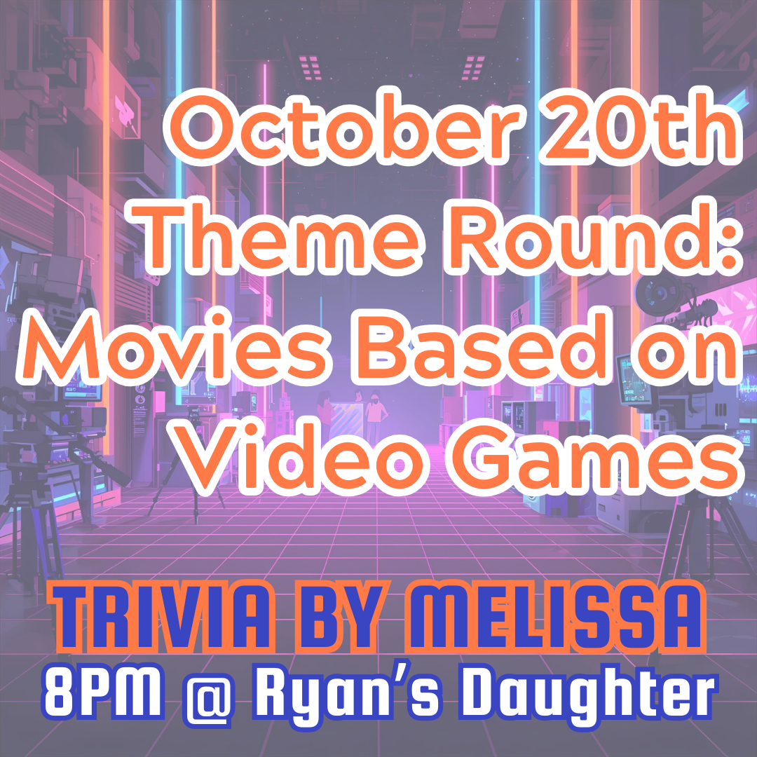 Oct 20 Theme Round: Movies Based on Video Games Monday, October 20, 2025 8:00 PM 10:00 PM Google Calendar ICS View Event →