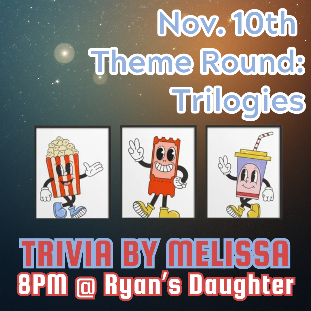 Upcoming Trivia Theme Rounds Upcoming events.Reach out about hosting private events! Dec 15 Theme Round: Holiday Movies Monday, December 15, 2025 8:00 PM 10:00 PM Google Calendar ICS View Event → Dec 1 Theme Round: Toys Monday, December 1, 2025 8:00 PM 10:00 PM Google Calendar ICS View Event → Nov 24 Theme Round: Video Games Soundtracks Monday, November 24, 2025 8:00 PM 10:00 PM Google Calendar ICS View Event → Nov 17 Theme Round: Mythology Monday, November 17, 2025 8:00 PM 10:00 PM Google Calendar ICS View Event → Nov 10 Theme Round: Trilogies Monday, November 10, 2025 8:00 PM 10:00 PM Google Calendar ICS View Event → Nov 3 Theme Round: HBO Originals Monday, November 3, 2025 8:00 PM 10:00 PM Google Calendar ICS View Event → Oct 27 Theme Round: K-Pop Monday, October 27, 2025 8:00 PM 10:00 PM Google Calendar ICS View Event → Oct 20 Theme Round: Movies Based on Video Games Monday, October 20, 2025 8:00 PM 10:00 PM Google Calendar ICS View Event → Oct 13 Theme Round: Schitt’s Creek Monday, October 13, 2025 8:00 PM 10:00 PM Google Calendar ICS View Event → Oct 6 Theme Round: Basketball Monday, October 6, 2025 8:00 PM 10:00 PM Google Calendar ICS View Event → Sep 29 Theme Round: The Thursday Murder Club Monday, September 29, 2025 8:00 PM 10:00 PM Google Calendar ICS View Event → Sep 22 Theme Round: Stately Songs Monday, September 22, 2025 8:00 PM 10:00 PM Google Calendar ICS View Event → Sep 15 Theme Round: 80s Movies Monday, September 15, 2025 8:00 PM 10:00 PM Google Calendar ICS View Event → Aug 25 Theme Round: Taylor Swift Monday, August 25, 2025 8:00 PM 10:00 PM Google Calendar ICS View Event → Aug 18 Theme Round: Dance Monday, August 18, 2025 8:00 PM 10:00 PM Google Calendar ICS View Event → Aug 11 Theme Round: TV Villains Monday, August 11, 2025 8:00 PM 10:00 PM Google Calendar ICS View Event → Aug 4 Theme Round: Leonardo DiCaprio Monday, August 4, 2025 8:00 PM 10:00 PM Google Calendar ICS View Event → Jul 28 Theme Round: Harry Potter Monday, July 28, 2025 8:00 PM 10:00 PM Google Calendar ICS View Event → Jul 21 Theme Round: Superhero Movies Monday, July 21, 2025 8:00 PM 10:00 PM Google Calendar ICS View Event → Jul 14 Theme Round: Baseball Monday, July 14, 2025 8:00 PM 10:00 PM Google Calendar ICS View Event → Jun 30 Theme Round: Dogs Monday, June 30, 2025 8:00 PM 10:00 PM Google Calendar ICS View Event → Jun 23 Theme Round: Celebrity Pseudonyms Monday, June 23, 2025 8:00 PM 10:00 PM Google Calendar ICS View Event → Jun 16 Theme Round: Cover Songs Monday, June 16, 2025 8:00 PM 10:00 PM Google Calendar ICS View Event → Jun 9 Theme Round: Pixar Movies Monday, June 9, 2025 8:00 PM 10:00 PM Google Calendar ICS View Event → Jun 2 Theme Round: Game Shows Monday, June 2, 2025 8:00 PM 10:00 PM Google Calendar ICS View Event → May 19 Theme Round: Mission Impossible Monday, May 19, 2025 8:00 PM 10:00 PM Google Calendar ICS View Event → May 12 Theme Round: TV Based on Movies Monday, May 12, 2025 8:00 PM 10:00 PM Google Calendar ICS View Event → May 5 Theme Round: Indie Rock Monday, May 5, 2025 8:00 PM 10:00 PM Google Calendar ICS View Event → Apr 28 Theme Round: Seinfeld Monday, April 28, 2025 8:00 PM 10:00 PM Google Calendar ICS View Event → Apr 21 Theme Round: Hockey Monday, April 21, 2025 8:00 PM 10:00 PM Google Calendar ICS View Event → Apr 14 Theme Round: A24 Movies Monday, April 14, 2025 8:00 PM 10:00 PM Google Calendar ICS View Event →